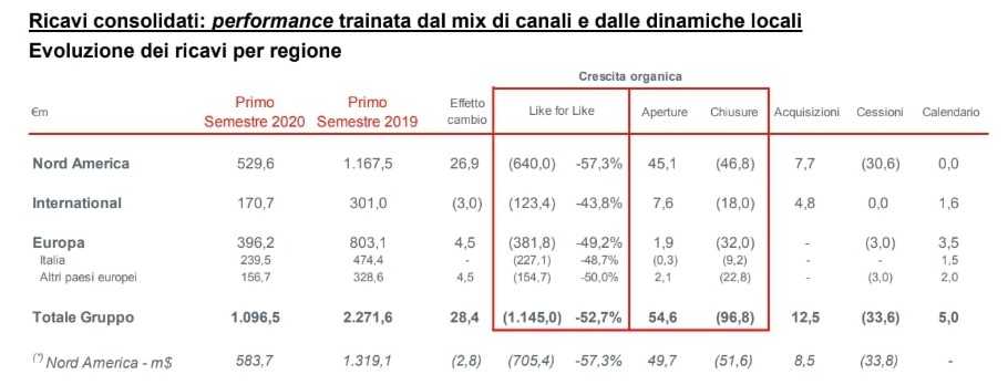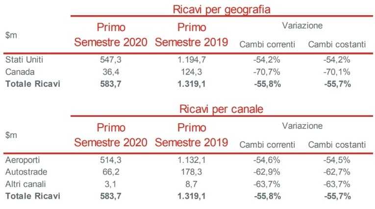 Nord America: ricavi pari a $584m nel primo semestre 2020, in calo del 55,8% (-55,7% a cambi costanti) rispetto a $1.319m nell’esercizio precedente.