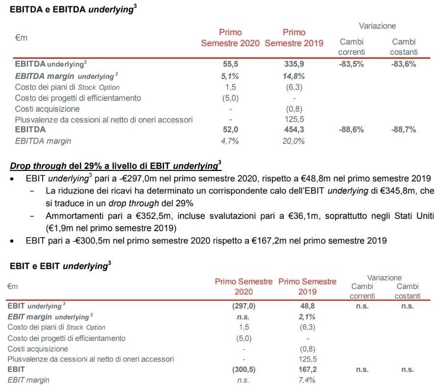 Ebidta underlying: a €55,5m nel primo semestre 2020 (€335,9m nel primo semestre 2019), con un calo dell’83,5% a cambi correnti (-83,6% a cambi costanti) rispetto al primo semestre 2019.