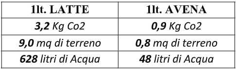 A proposito di tutela dell’ambiente e delle bevande, analizziamo velocemente la seguente tabella che rappresenta l’impatto che il latte vaccino ha sull’ambiente, rispetto a una delle bevande che impatta meno in assoluto: l’avena: