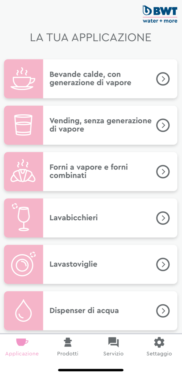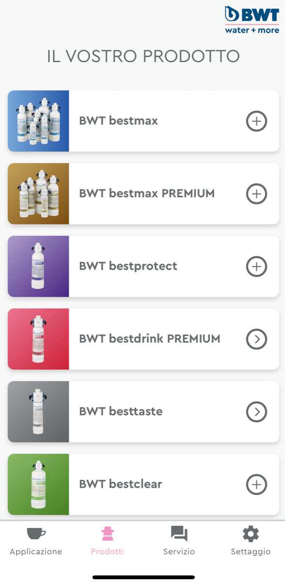 Basta scaricare la App ed inserire i parametri di valutazione: valori di ph, conducibilità, durezza dell’acqua e quantità di potabile utilizzata in un mese che caratterizzano il luogo previsto per l’installazione. Volendo anche il numero delle tazze utilizzate ogni giorno. Si saprà immediatamente quale modello della vasta gamma di cartucce o osmosi inversa BWT deve essere installato per avere il migliore risultato.