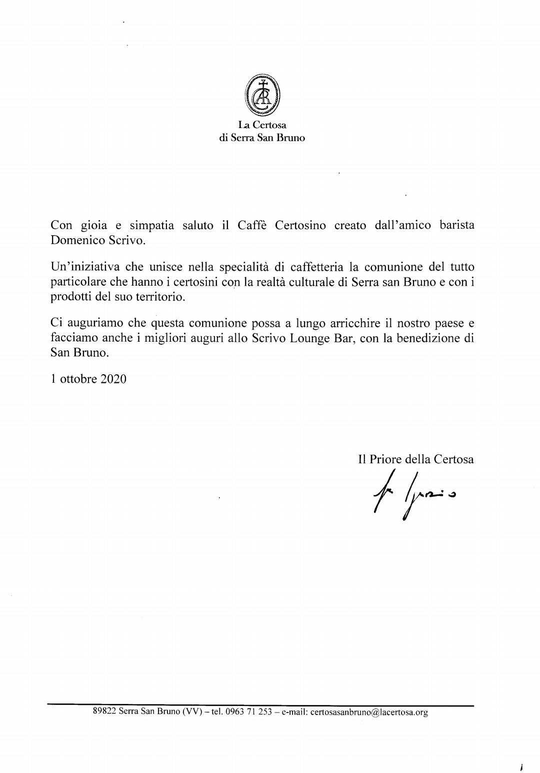 Che i visitatori potranno degustare durante la giornata del primo ottobre quando verrà presentato per la prima volta al pubblico. Così come ha raccontato il titolare, nonché creatore della ricetta, Domenico Scrivo, il Caffè Certosino: “Nasce dalla proposta di un mio caro cliente, il fotografo Bruno Tripodi, che era solito venire nel mio locale a prendere un caffe ; un giorno mi disse: “Beh Domenico, tutti conosciamo la notorieta