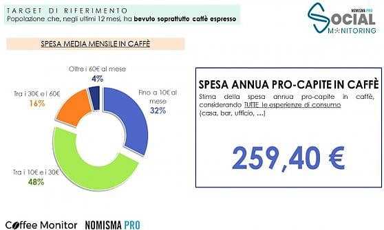 Attraverso la rilevazione di abitudini di consumo di un campione rappresentativo della popolazione il Coffee Monitor Nomisma Pro fornisce inoltre una stima della spesa annua in caffè che – tra i consumatori di caffè espresso – sfiora i 260euro annui pro-capite.