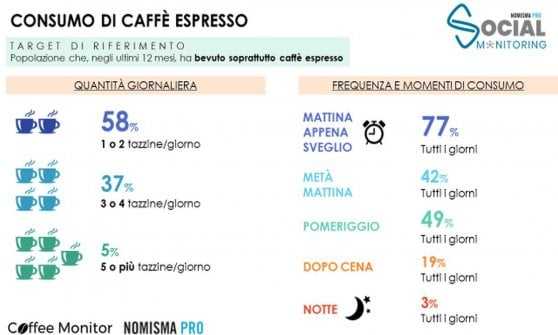 Chi consuma caffè espresso beve principalmente 1 o 2 tazzine al giorno (58%). Inoltre, lo preferisce la mattina come momento di consumo: il 77% di chi beve caffè espresso lo fa tutti i giorni appena sveglio.