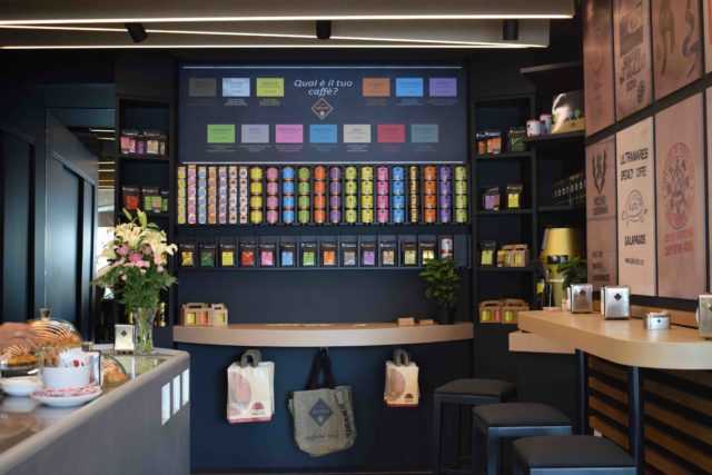 il pavimento è nero rigato con listelli di alluminio. L’arcobaleno di colori che subito attira l’attenzione si trova sulla parete di fondo, dove spiccano le confezioni di 11 diverse proposte di caffè sormontate da un’insolita testata che chiede “Qual è il tuo caffè?”.