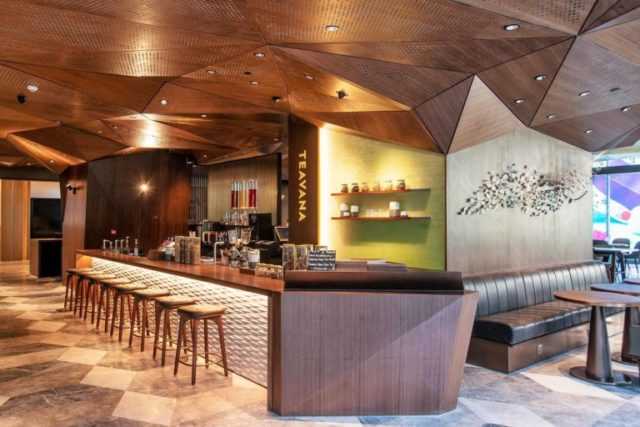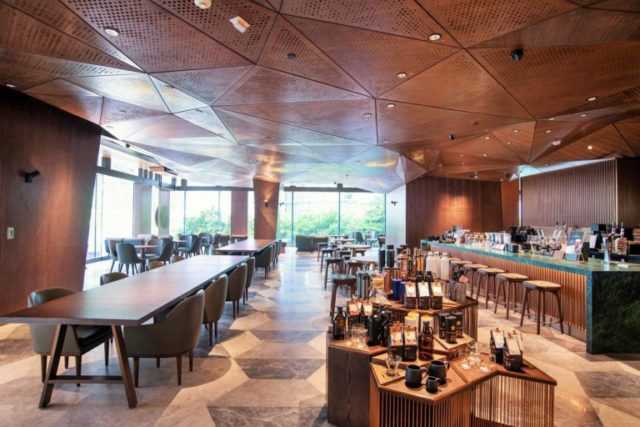 Il banco bar della Starbucks Reserve è in marmo di tonalità verde intenso. Ispirata alle piantagioni di caffè così come il grande pilastro centrale attorno a cui si articola lo spazio, sul quale i designer locali Fa e Jun di Kanvas Studio hanno creato un’opera d’arte realizzata con 250 pezzi di ceramica artigianale ispirati alle forme naturale delle foglie di caffè e di tè; il soffitto è realizzato con 370 pezzi di pannelli geometrici in legno a forma di foglie di caffè.