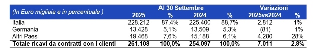 Al 30 settembre 2025, CLI ha realizzato ricavi pari a 261,1 milioni di Euro, come di seguito suddivisi per linee di business: