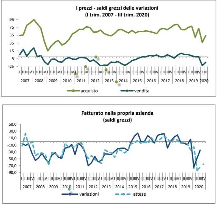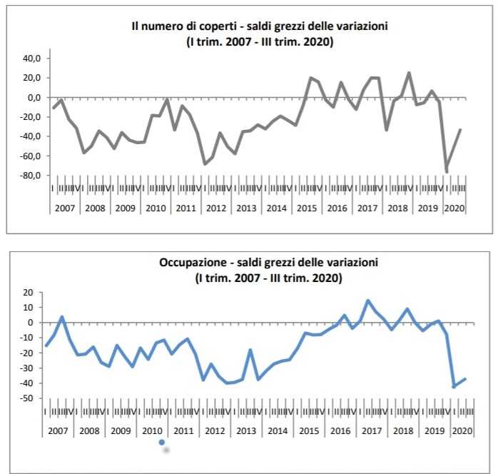 I costi di approvvigionamento ed i prezzi di vendita vengono dati in flessione rispetto ad un anno fa. E poi c’è l’occupazione: fortemente negative, ma non potrebbe essere diversamente, le valutazioni sulla dinamica del lavoro nel terzo trimestre del 2020 che, nel confronto con l’anno precedente, perde circa 37 punti percentuali.