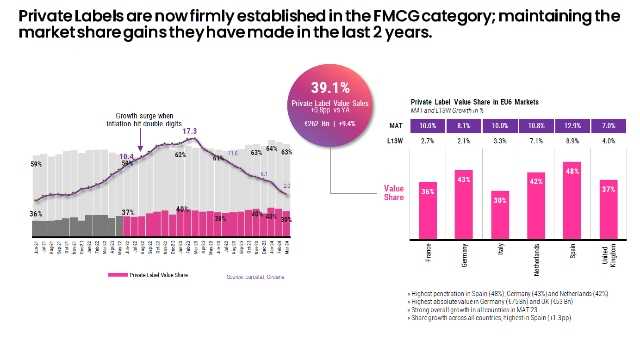 Nonostante le forti pressioni inflazionistiche nel settore FMCG, le MDD hanno registrato una crescita del 9,4% nei valori di vendite e un incremento del 2,2% di volume nei sei principali mercati europei (EU6 – Francia, Germania, Italia, Paesi Bassi, Spagna e Regno Unito) con dati a marzo 2024. Con una quota di mercato del 39% in valore e del 46% in unità vendute, le MDD si sono affermate come attori chiave del settore.