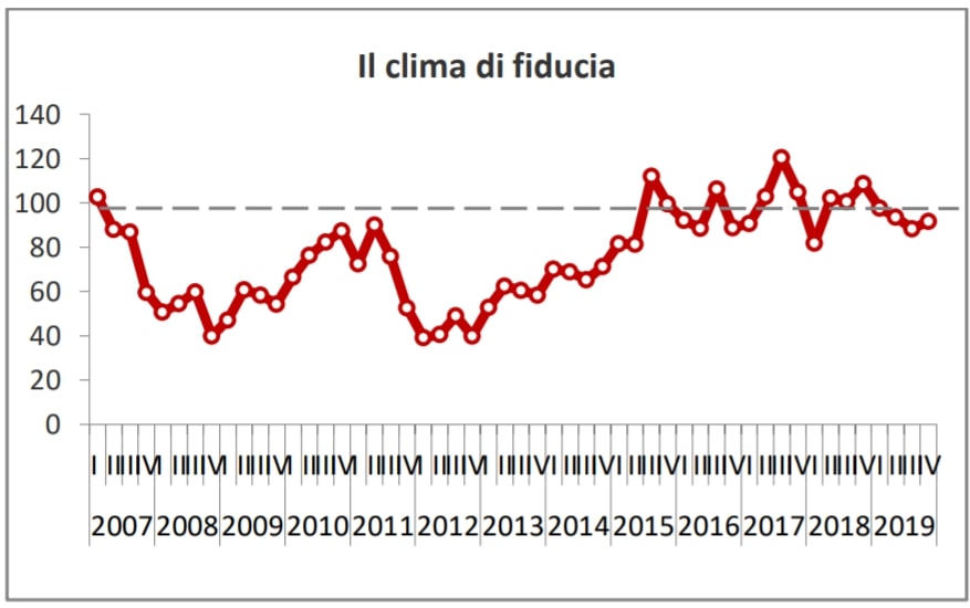 MILANO – Nel quarto trimestre 2019 l’indicatore del clima di fiducia è inferiore di 17 punti rispetto allo stesso periodo di un anno fa. I giudizi verso le aspettative di breve termine non sono positive verso le performance economiche e le prospettive occupazionali. Negativo il confronto anno su anno (2019 su 2018).
