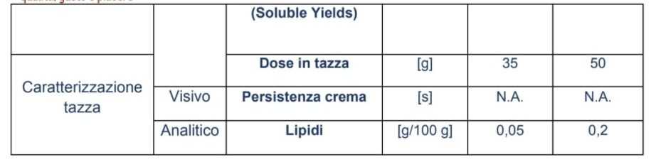 Dose in tazza: Quantità di campione erogato (diviso per il numero di tazze della caffettiera), pesato mediante bilancia di precisione (con sensibilità di 0.1 g ).