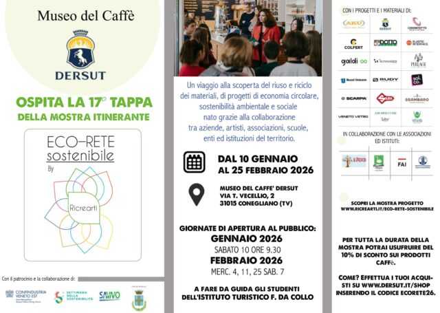 CONEGLIANO – La mostra Eco-rete sostenibile by Ricrearti torna al Museo del Caffè Dersut, rinnovandosi ogni anno grazie a quel valore aggiunto che nasce dalla fantasia e dalla capacità di trasformare i materiali, facendo rete tra le imprese del Gruppo Sostenibilità di Confindustria Veneto Est, di cui Dersut Caffè fa parte.