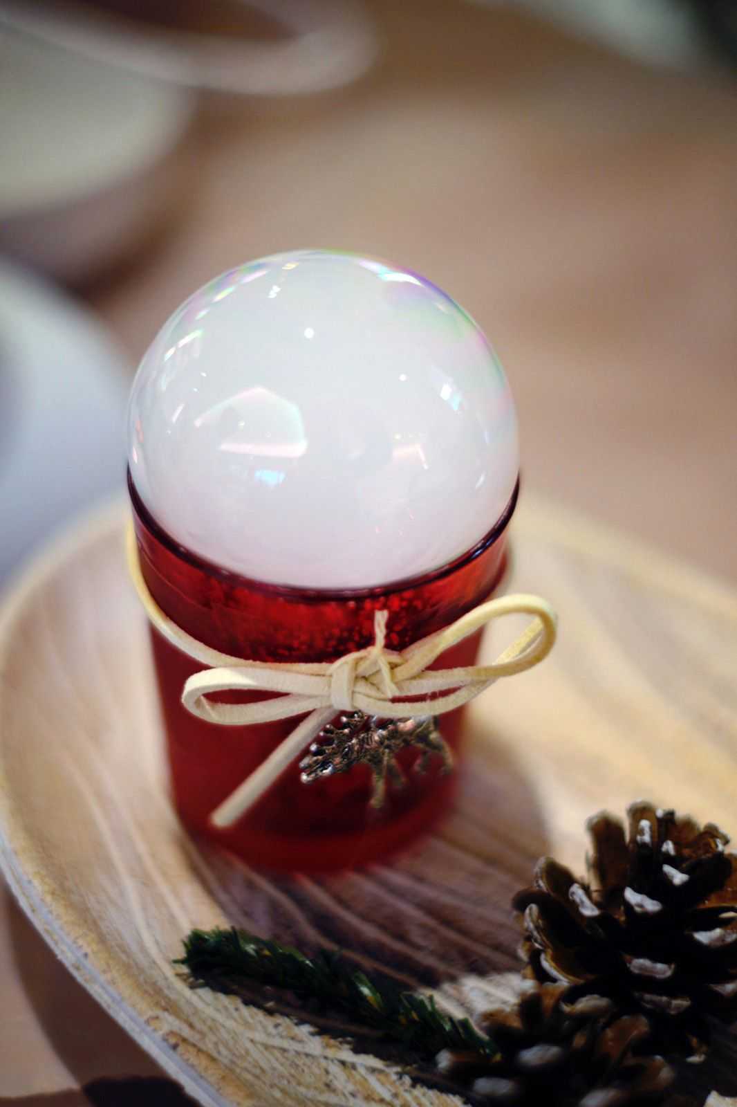 Fabbri, cocoglucoside e aroma panettone (mix arancio e vaniglia) che permette di stabilizzare la bolla sul bicchierino; successivamente con la pistola sparabolle, creare la bolla con il fumo aromatizzato direttamente sulla superficie del bicchiere.