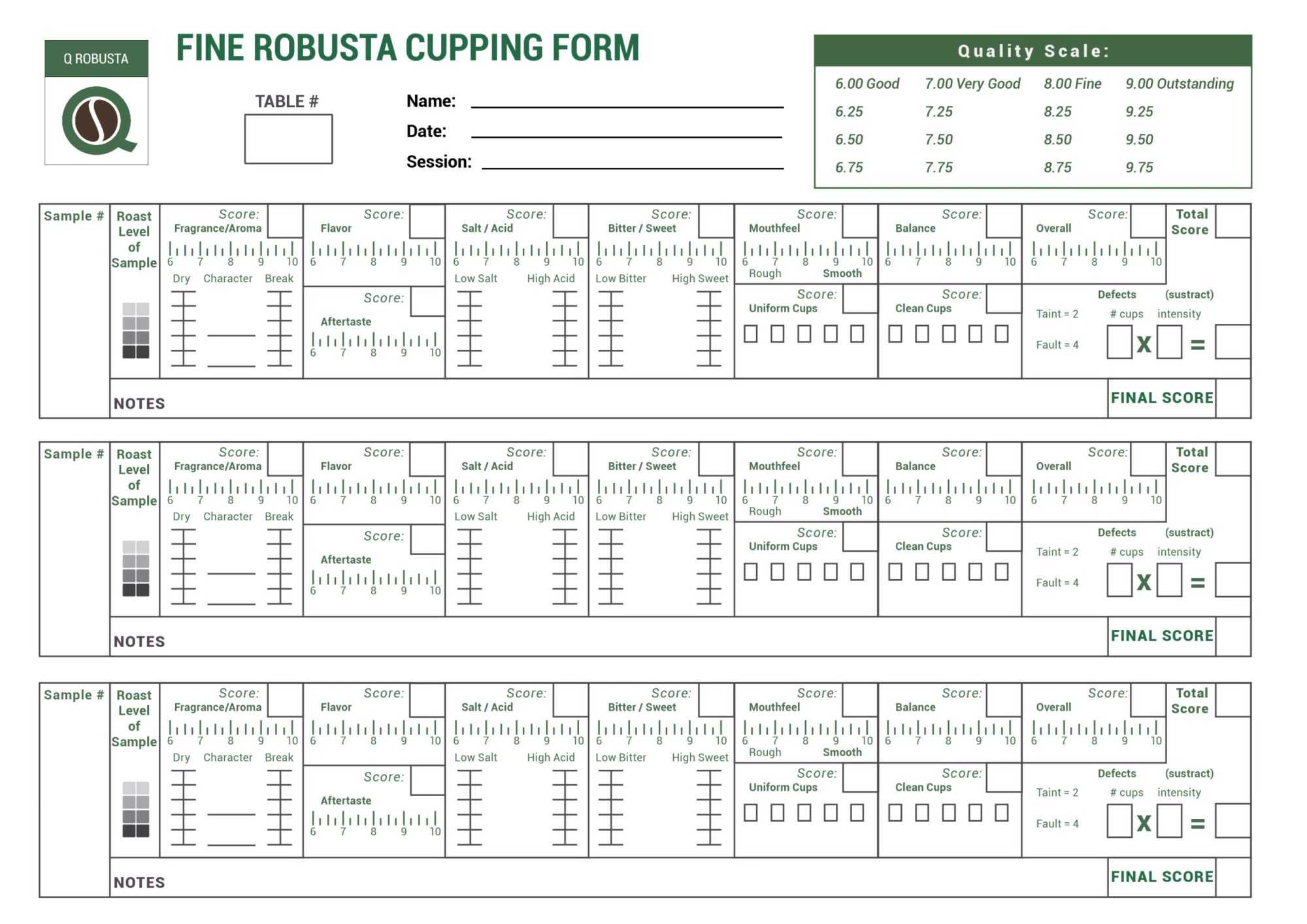 La scheda di assaggio del Fine Robusta tiene conto delle caratteristiche sensoriali caratteristiche di questa specie, differenti dall’Arabica, che caratterizzano la sua valutazione qualitativa