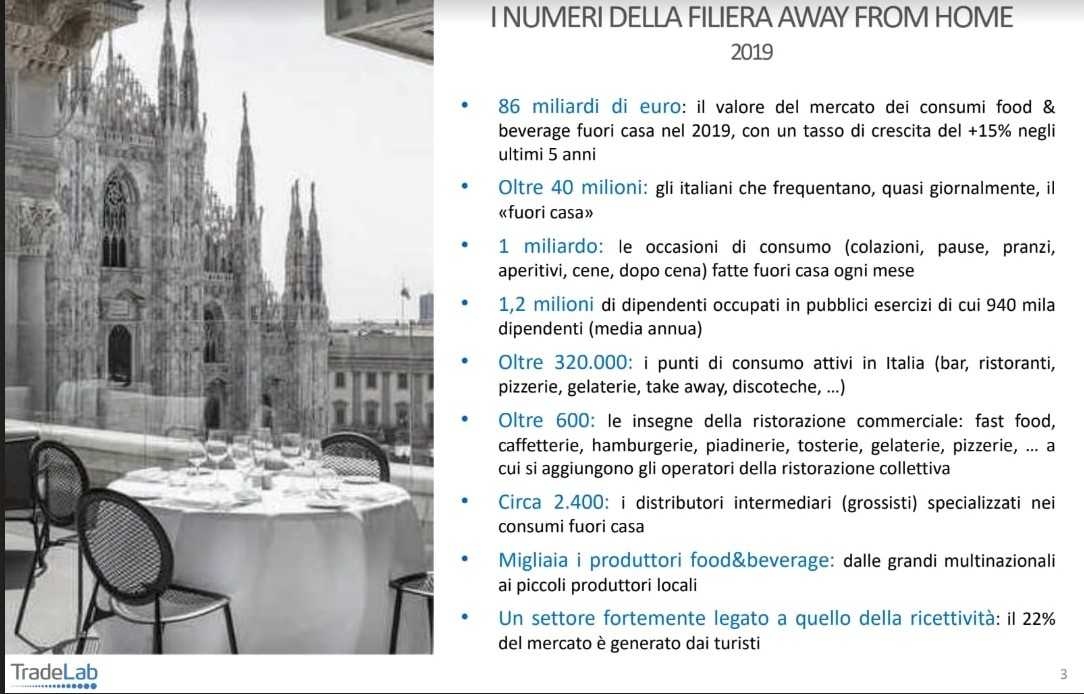 MILANO – Quale ritorno ai consumi fuori casa? Mentre si delineano i contorni della cosiddetta “fase due”, un’analisi condotta da TradeLab, nella prima settimana di aprile, approfondisce lo scenario del ritorno ai consumi Fuori Casa nel post lockdown. I numeri della filiera dei consumi Fuori Casa/Away From Home. Un mercato che nel 2019 vale oltre 86 miliardi di euro. Frequentato da circa 40 milioni di Italiani che generano, ogni mese, un miliardo di occasioni di consumo tra colazioni, pause, pranzi, aperitivi; cene e dopo cena fatte fuori casa.
