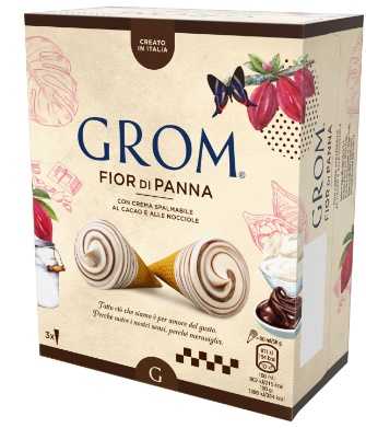 Continuando in questo modo a perseguire l’obiettivo di portare a più persone, e in nuove occasioni di acquisto e di consumo, l’esperienza della gelateria italiana. È nato così il cono confezionato Grom, realizzato secondo i principi che da sempre contraddistinguono la filosofia dell’azienda: ingredienti di origine naturale e assenza di coloranti o aromi, sia nelle materie prime selezionate che nel prodotto finito. L’estetica stessa del cono rende omaggio all’heritage del marchio, riprendendo il movimento “circolare” che compie la spatola nel disporre il gelato sulla cialda. La composizione è invece inedita per Grom, che per la prima volta abbina il gelato alla crema spalmabile, creando una dialettica intrigante tra texture e temperature diverse.
