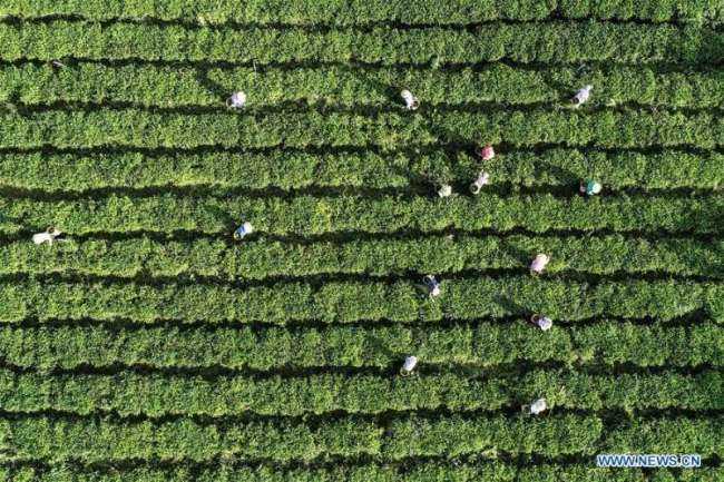 In questa foto scattata il 10 giugno, un agricoltore sta raccogliendo foglie di tè in una piantagione della cooperativa del tè Wulilu nella contea autonoma di Baisha Li, nella provincia di Hainan. Con una piantagione di circa 26,6 ettari, la cooperativa Wulilu ha aiutato 362 famiglie povere ad affrancarsi dalla povertà.