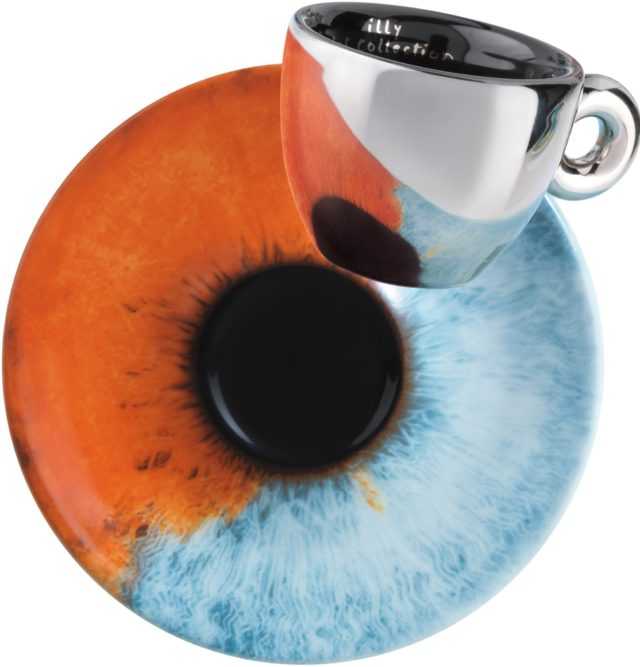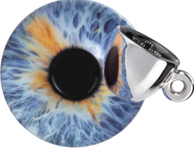 sua serie Iris – la collezione di dipinti su tele circolari che riproducono l’iride dell’occhio – creando sei variazioni sul tema. Un autentico gioco di sguardi tra l’osservatore e le screziature variopinte impresse sul piattino, che si specchiano poi a vicenda sulla superficie riflettente della tazzina.