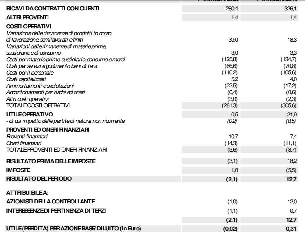 Il margine operativo lordo ante oneri non ricorrenti (EBITDA) è risultato pari a 23,2 milioni di euro (39,2 milioni al 31 marzo 2019) e il margine operativo lordo (EBITDA) a 23 milioni di euro (38,7 milioni al 31 marzo 2019). L’utile operativo (EBIT) è risultato pari a 0,5 milioni di euro (21,9 milioni al 31 marzo 2019). Mentre il risultato prima delle imposte è negativo per 3,1 milioni di euro (18,2 milioni al 31 marzo 2019).
