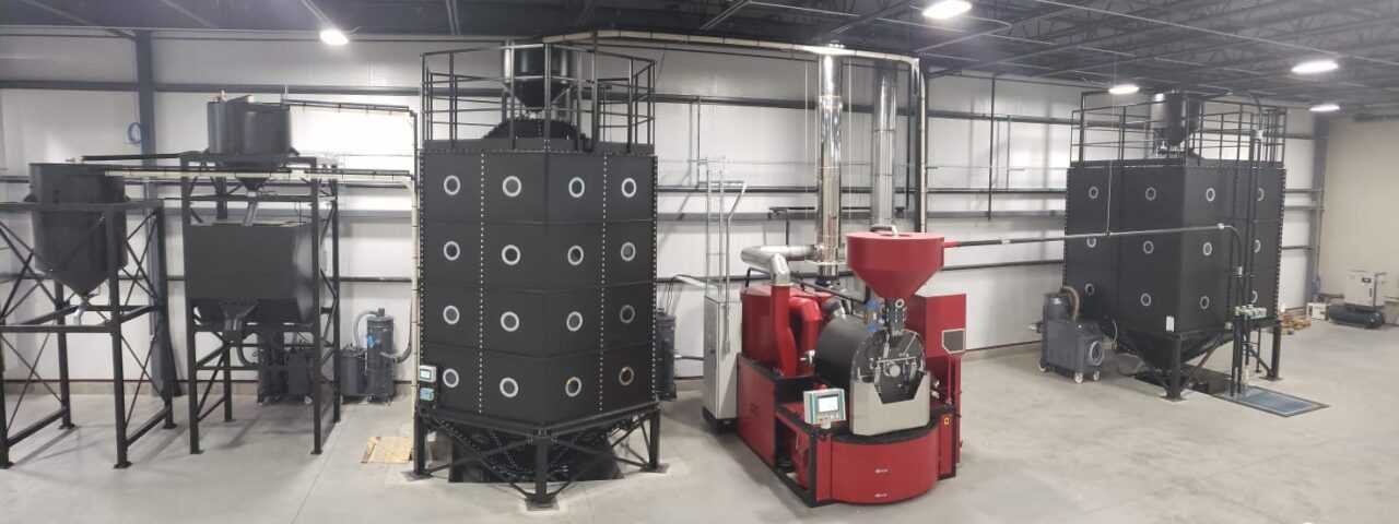 fumi con ricircolo, spietratrice e caricatore di caffè verde integrati in uno spazio compatto.
