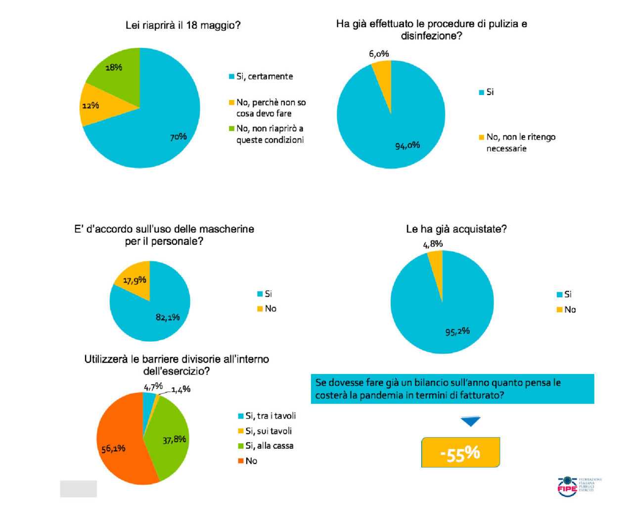 Il 95% degli imprenditori intervistati, infatti, ha già acquistato le mascherine per il proprio personale, l’82% dei ristoratori è convinto che l’uso dei dispositivi di protezione sia essenziale, mentre il 94% ha già effettuato la sanificazione dei locali.