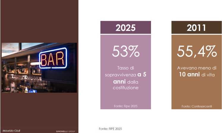 Lo dimostra del resto l’ancora alta mortalità: secondo l’ultimo rapporto Fipe il tasso di sopravvivenza a cinque anni dalla costituzione è pari al 53%; se confrontato ad uno studio Confesercenti del 2011, citato nel libro, in cui risultava che il 55,4% degli esercizi avevano meno di 10 anni di vita e che il 40% degli esercizi chiudevano entro i primi 4 anni capiamo che la situazione non è migliorata.