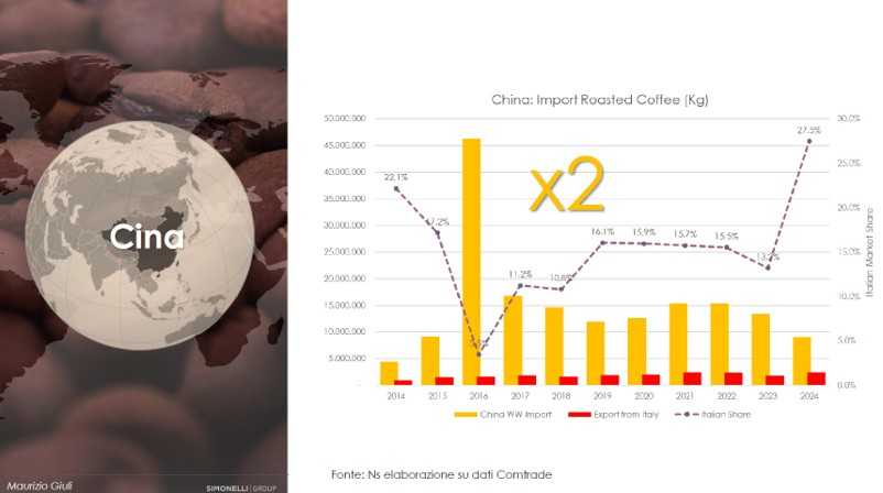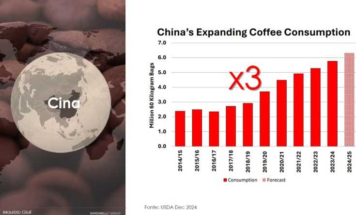 Il consumo di caffè in Cina è guidato dalle caffetterie, che secondo Mintel nel 2024 hanno raggiunto quota 161.800 (+12.000 sul 2023). Questa evoluzione non è stata solo quantitativa, ma anche qualitativa perché i consumatori cinesi preferiscono sempre più caffè speciali di alta qualità, rispecchiando le tendenze osservate nei paesi occidentali. La Cina acquista sempre più caffè dal Brasile e Colombia anziché dal Vietnam e Indonesia come faceva in passato.