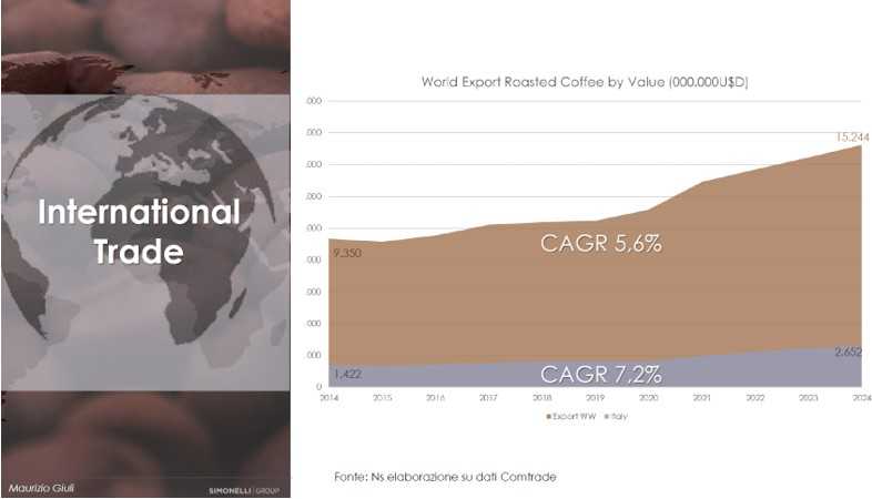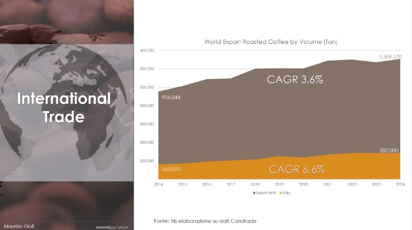 A livello mondiale l’export di caffè tostato è cresciuto nel periodo 2014-2024 con un tasso medio del 3,6%. Il caffè italiano è cresciuto ad un tasso quasi doppio.