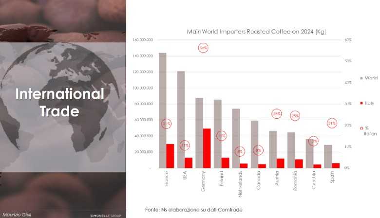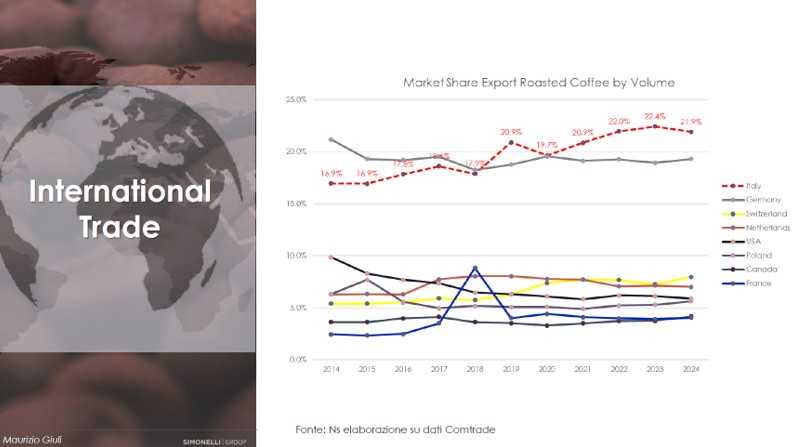 Dal 2019 l’Italia è diventato il primo esportatore al mondo per volumi di caffè tostato raggiungendo una quota vicina al 22%.