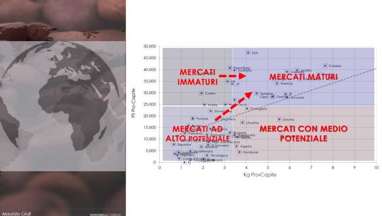 Nel libro avevamo proposto il modello PIL-consumo-pro-capite per individuare le aree a maggiore potenzialità di crescita dei consumi. Riprendendo quello stesso modello notiamo che in questo decennio diversi paesi che stavano nel quadrante degli immaturi, come UK e Corea, si sono nel frattempo spostati verso quello dei maturi perché hanno superato quelle barriere culturali che limitavano il consumo di caffè, mentre altri che erano nel quadrante ad alto potenziale hanno fatto notevoli progressi sia in termini di ricchezza che di consumo di caffè tendendo anch’essi al quadrante dei maturi.