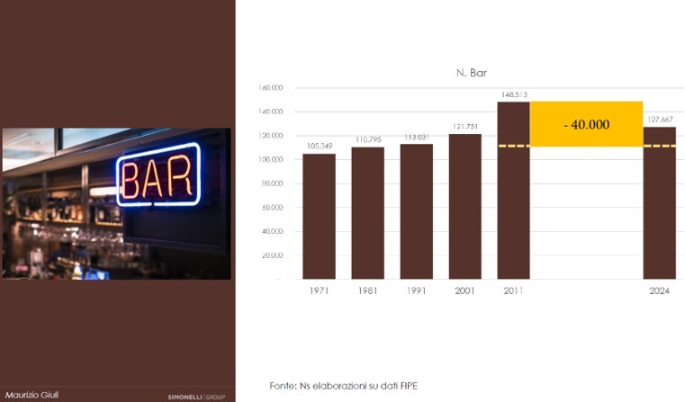 Riportare la densità ai valori di quegli anni significherebbe scendere di ulteriori 25.000 unità, che potrebbero diventa 30.000 unità se si tiene conto del diverso contesto sociale. E’ chiaro che questo numero può variare a seconda della capacità degli operatori di creare formule più attrattive, capaci di attrarre i giovani e riportare traffico e momenti di consumo al loro interno rendendo il bar un’attività sufficientemente redditizia.