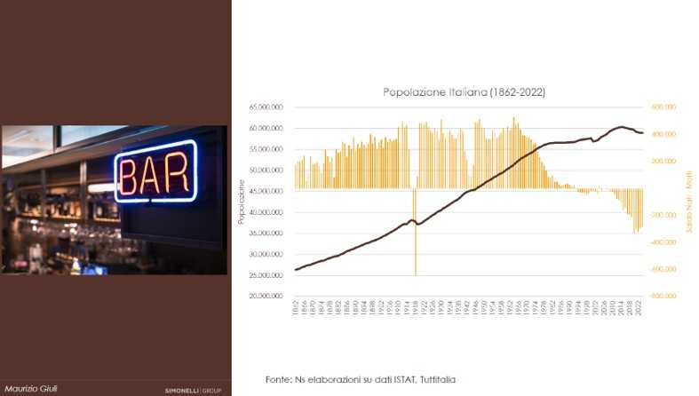 A questo aspetto sociale si associa un secondo fattore, ovvero quello della curva della popolazione, che come vediamo dal seguente grafico, non solo si sta abbassando, ma se osserviamo gli istogrammi gialli che indicano il saldo nati-morti, a partire dal 1993, il saldo è negativo e questa differenza negli ultimi anni diventa sempre più accentuata. Ciò impatta sulla morfologia della popolazione.