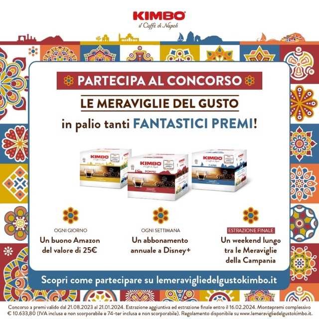 NAPOLI – Prosegue fino al 21 gennaio del 2024 “Le meraviglie del gusto”, il grande concorso a premi firmato dal brand Kimbo dedicato agli amanti del caffè di Napoli e delle meraviglie della Campania. Partecipare è semplicissimo: basta acquistare almeno una confezione di cialde o capsule compatibili Nespresso Original e A Modo Mio della linea Le meraviglie del gusto provvisti di bollino del concorso (disponibili nelle miscele Amalfi, Capri, Pompei e Positano) presso i negozi specializzati nella vendita del caffè, nei negozi di prossimità, nei punti vendita autostradali che aderiscono all’iniziativa, sul sito ed Amazon.