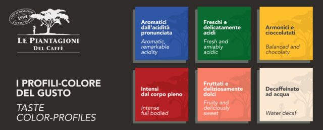 Ad ognuno dei quali fa capo un profilo di gusto. La scelta di individuare dei Profili Colori del Gusto è nata per offrire uno strumento di scelta semplice e rapido. Così Le Piantagioni del Caffè non solo si impegna a selezionare, lavorare al meglio le materie prime ed essere trasparente nei confronti dei baristi e del consumatore finale; ma al contempo offre all’operatore del settore una modalità di scelta semplice, che lo guida nella proposta al cliente finale.