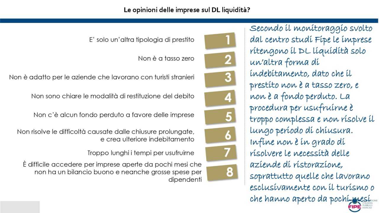 Secondo il monitoraggio svolto dal centro studi Fipe le imprese ritengono il DL liquidità solo un’altra forma di indebitamento. Dato che il prestito non è a tasso zero, e non è a fondo perduto.