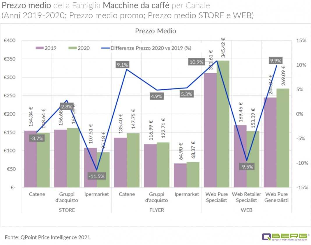 I gruppi d’acquisto, invece, nel 2020 hanno proposto macchine da caffè per un pubblico di fascia media, con una strategia più articolata rispetto alle catene. Andando nel dettaglio, hanno allineato i prezzi dell’offerta store con quella dei web retailer specialist ma, allo stesso tempo, hanno garantito prezzi medi decisamente concorrenziali (circa -15%) per le promozioni flyer rispetto alle catene, raggiungendo così anche il segmento medio-basso del mercato