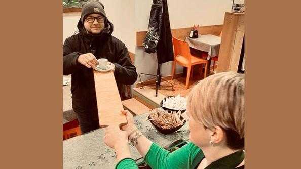 Mentre il coronavirus, volenti o nolenti, sta cambiando la vita di tutti noi, i veronesi provano a prenderla con ironia. E così, per scherzare sulla norma che impone la distanza di un metro fra un cliente e l'altro e di non servire caffè al banco, la titolare Rosalba Boscaini usa un lungo tagliere per servire il cliente. A prova di «droplet»