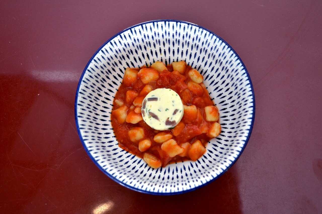 Come primo piatto “Gnocchetti di patate con salsa al triplo pomodoro, burro e acciuga”, seguito da “Faraona-cake con salsa di scalogno e aceto balsamico”, un crab cake che sostituisce il granchio con la faraona, servito su insalata al balsamico e salsa di scalogno e balsamico.