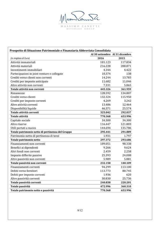 Di seguito sono riportati i principali dati economico-finanziari del Massimo Zanetti Beverage Group al 30 settembre 2016
