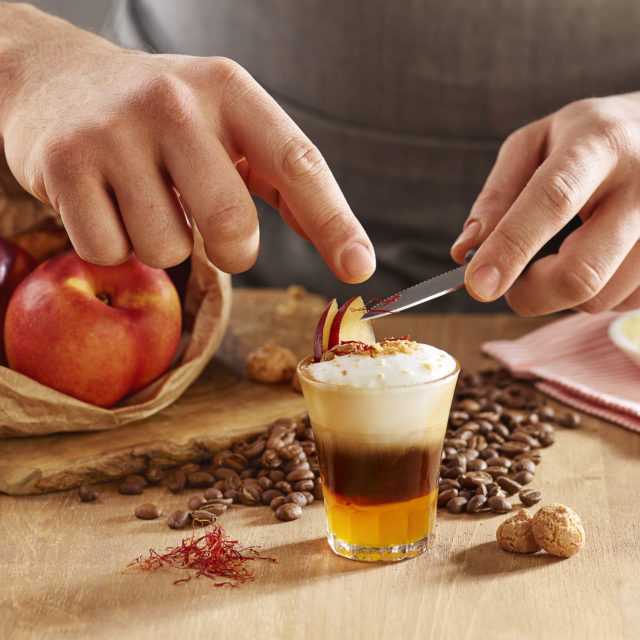 Con un tocco di pesca. Quali sono gli ingredienti necessari alla preparazione di questa bevanda gustosa? E’ necessario innanzitutto avere 15g di topping pesca e zafferano. Poi, 4/5 cubetti di pesca (fresca o sciroppata) e 1 caffè espresso (25ml). Consigliato, come sempre, Brasile.