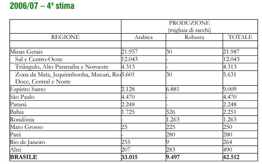 Il raccolto 2006/07 è dunque stimato in 42,51 milioni di sacchi, dei quali 33 di arabica e 9,5 di robusta. L’area coltivata è di 2,3 milioni di ettari. Dei quali 2,2 produttivi, per una produttività media è di 19,75 sacchi/ettaro. La revisione più consistente al rialzo rispetto ai dati della scorsa estate ha riguardato lo stato di Minas Gerais. La cui produzione è quantificata in quasi 22 milioni di sacchi (21,987), contro i 21,14 della stima precedente. Ritocchi limitati sono stati apportati alle cifre riguardanti Paraná e Bahia.