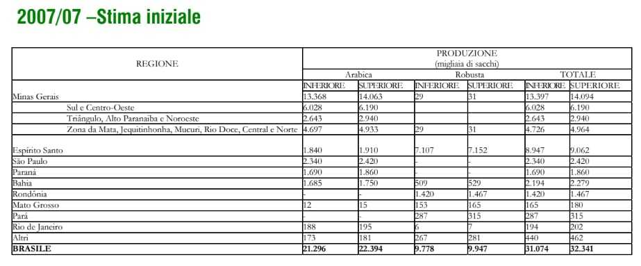 BRASILIA – Minas Gerais e São Paulo: com’è la situazione corrente? Il Conab (l’agenzia governativa per l’approvvigionamento agricolo) ha diffuso venerdì la sua prima stima sul raccolto brasiliano 2007/08, alla quale si è aggiunta anche la quarta stima sul raccolto 2006/07. Vediamo i dati nel dettaglio. Un milione di sacchi in più Le cifre relative 2006/07 sono state ritoccate al rialzo di quasi un milione di sacchi (da 41,57 a 42,51 milioni).