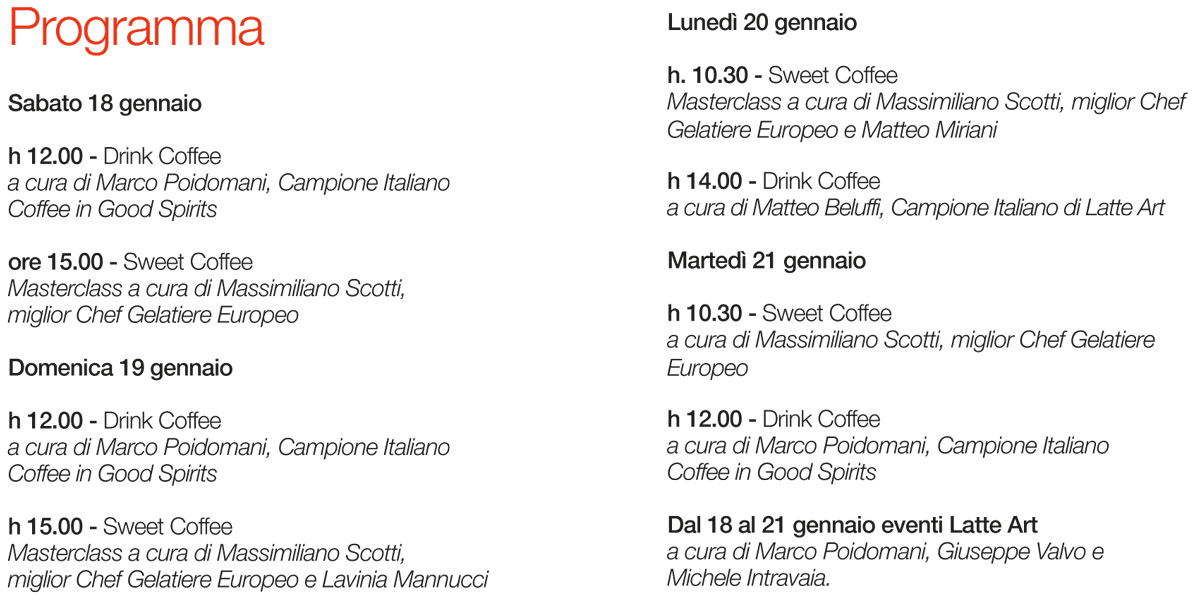 Massimiliano sarà presente nello spazio Moak con le masterclass “sweet coffee” sabato 18 e domenica 19 alle 15,00 e lunedì 20 e martedì 21 gennaio alle 10,30. Al suo fianco – domenica 19 alle ore 15,00, ci sarà anche Lavinia Mannucci,“Best international guest” al Gelato Festival di Londra. Famosa anche per aver rinunciato alla carriera di modella per dedicarsi alla sua grande passione per l’arte della gelateria, insieme a Massimiliano preparerà un gustosissimo Monte Bianco al caffè.
