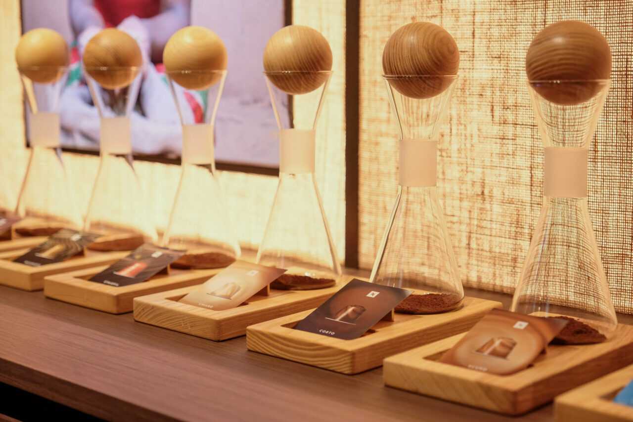 Nuovi ambienti che evocano in ogni aspetto la grande attenzione dell’azienda per la sostenibilità, a partire dalla scelta di inserire negli spazi una Recycling Unit, la nuova macchina dedicata al riciclo delle capsule esauste che vengono riportate dai consumatori in Boutique e che comunica su un display, sulla base del peso raggiunto, in quali oggetti sarà possibile trasformarle, dandogli una nuova vita: una bicicletta, una penna, un coltellino, differenti sono le nuove vite che le capsule possono acquisire grazie al recupero