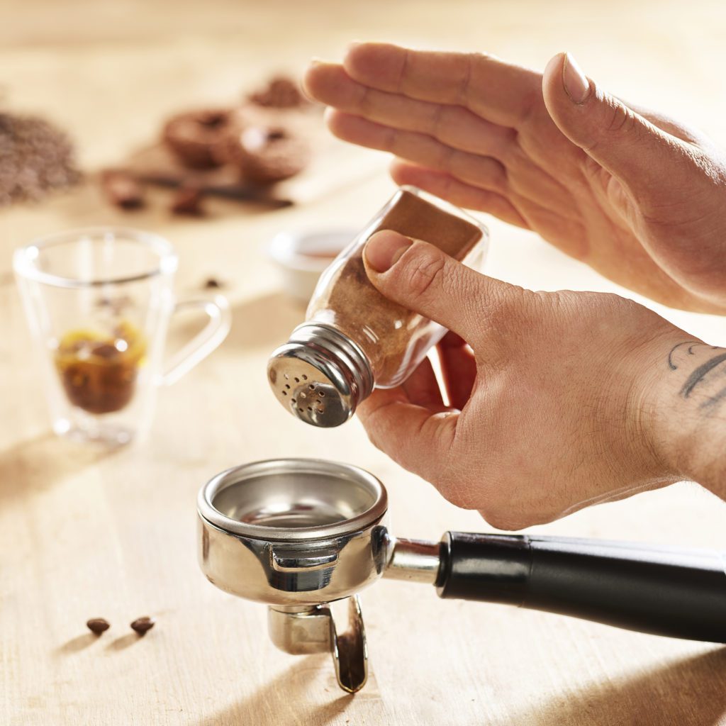 Prepara quindi un espresso aromatizzato alla cannella. Aggiungendo direttamente la cannella nel portafiltro con il caffè macinato) e versalo nel bicchiere.