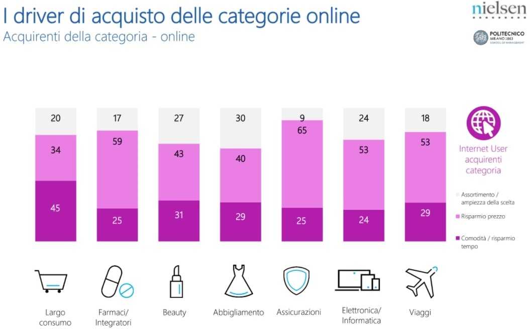 È interessante notare come ciascun individuo sia caratterizzato da un approccio multicanale eterogeneo a seconda della categoria merceologica. La diffusione di pratiche digitali end-to-end nei settori viaggi o elettrodomestici, ad esempio, potrebbe di fatto generare un effetto contaminante (spill-over) sulle aspettative e le abitudini di acquisto delle stessa persona in altre categorie a minor intensità digitale, quali, per citarne alcune, il largo consumo e il farmaceutico. In questo contesto, la principale sfida per le imprese è quella di progettare, sviluppare e veicolare strategie e iniziative sempre più convergenti per semplificare il processo d’acquisto e offrire un’esperienza omnicanale integrata”.