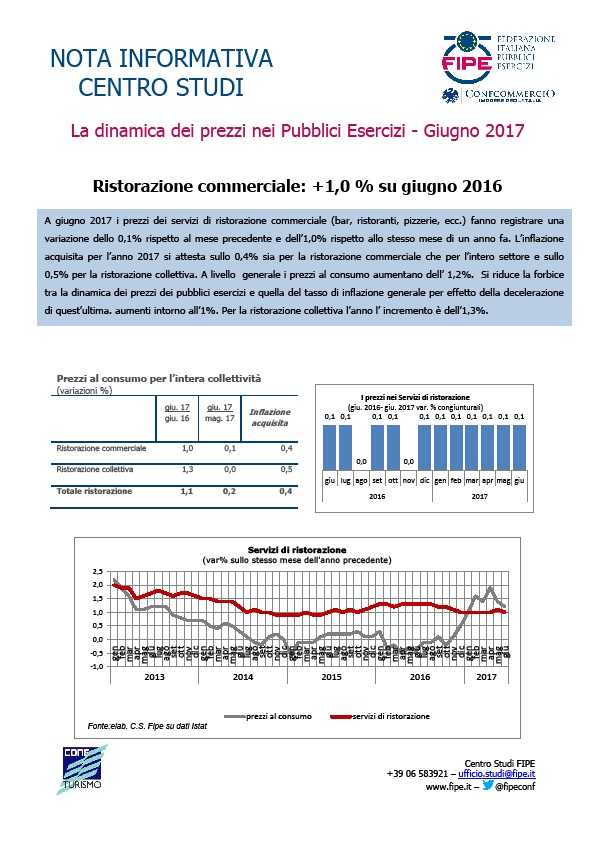 ROMA – A giugno 2017 i prezzi dei servizi di ristorazione commerciale (bar, ristoranti, pizzerie, ecc.) fanno registrare una variazione dello 0,1% rispetto al mese precedente e dell’1,0% rispetto allo stesso mese di un anno fa.