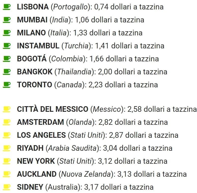 Questa volta è UBS (proprio la celebre banca svizzera) a toglierci ogni dubbio, intervistando i cittadini di città in tutto il mondo, per capire quanto costa bere un caffè. I prezzi in questa classifica si riferiscono a 25 città e sono valori medi.