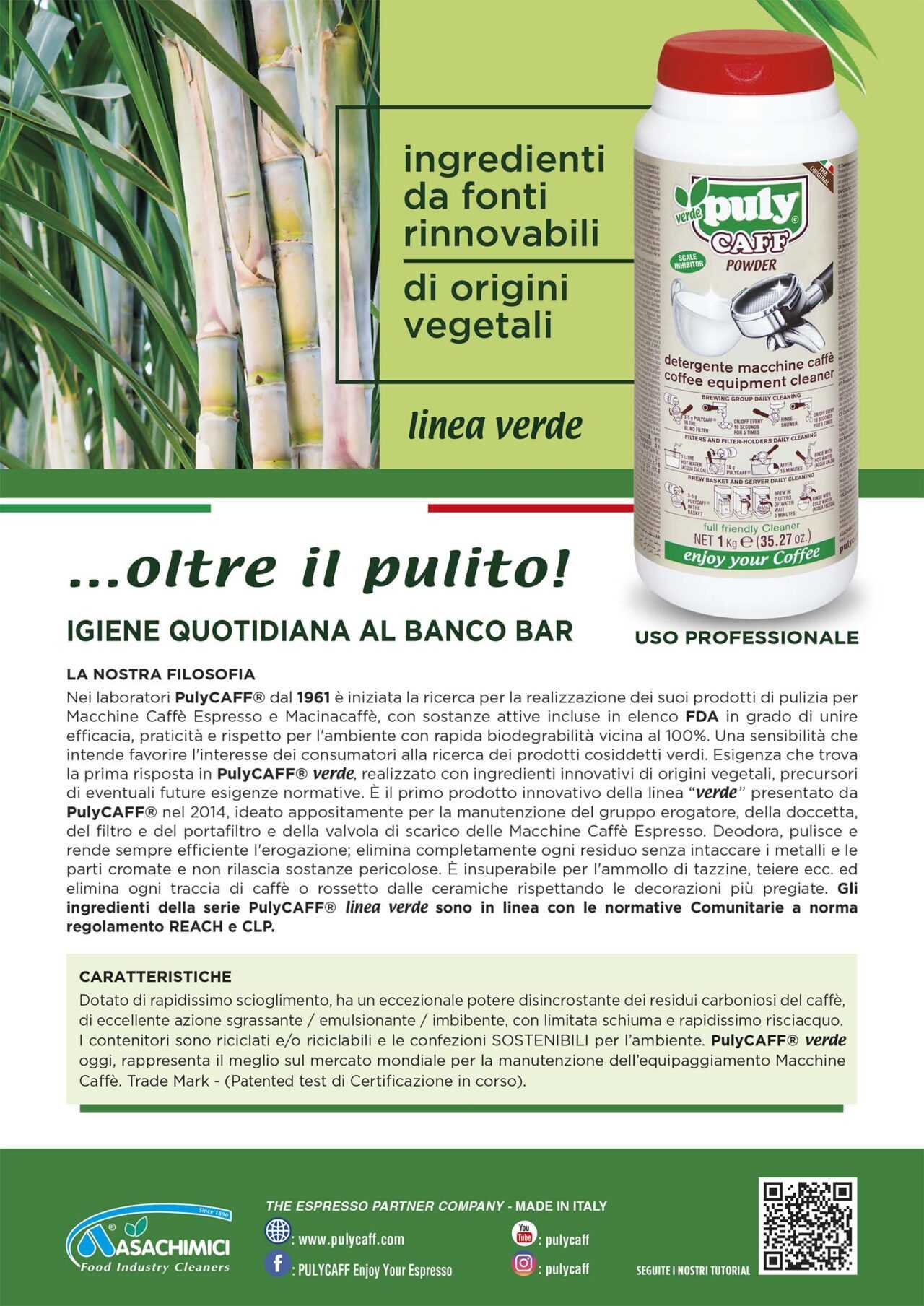 Una sensibilità in sintonia con l’interesse che sempre più consumatori mostrano nei confronti dell’ambiente e di prodotti realmente sostenibili. La prima risposta a questa esigenza è stato pulyCaff verde, realizzato con ingredienti innovativi sintetizzati da fonti rinnovabili, precursori di sicure future esigenze normative e con una biodegradabilità vicina al 100%: è stato il primo prodotto della linea “verde” presentato al mercato da pulyCaff nel 2014.