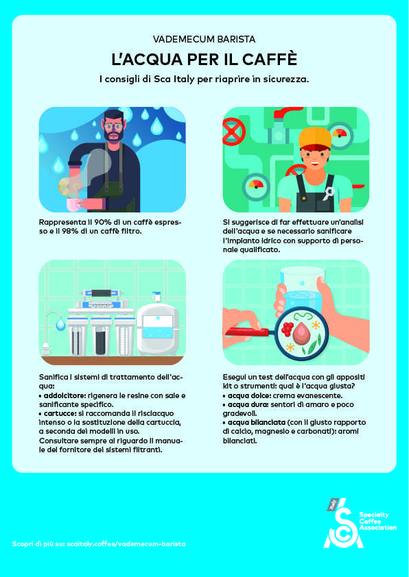 Pertanto, si è scelto di concentrarsi e sviluppare gli argomenti reputati di cruciale importanza in questa fase, ovvero l’acqua, il barista, le attrezzature e l’igiene.