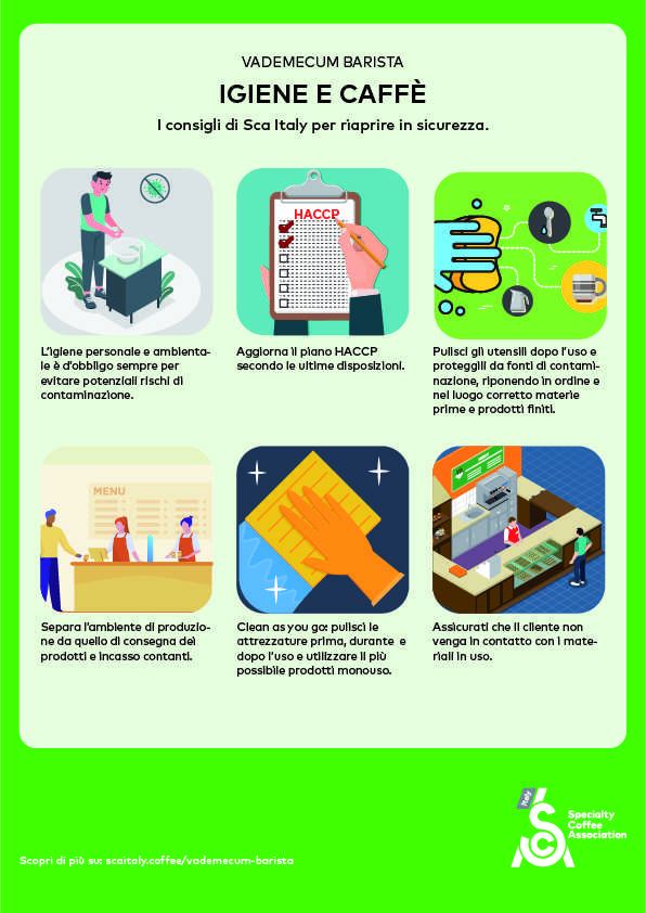 Alla pagina scaitaly.coffee/vademecum-barista è possibile accedere alle schede dettagliate dedicate ai vari argomenti e scaricare le infografiche, dove vengono sintetizzati in maniera semplice ed immediata, in modo che siano fruibili da più utenti